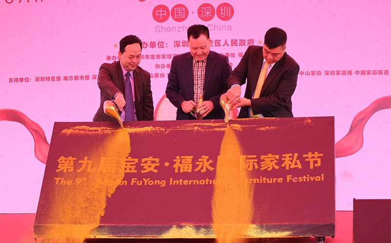 由張洪華會長等三位領(lǐng)導(dǎo)共同將金沙緩緩的撒在本屆牌匾上,令“第九屆寶安·福永國際家私節(jié)”幾個大字逐漸飽滿起來,相信咱們福永家私節(jié)這個品牌,一定會在未來創(chuàng)造更多的價(jià)值,就像金子一樣閃閃發(fā)光、熠熠生輝。祝賀第九屆家私節(jié)正式盛大開幕~