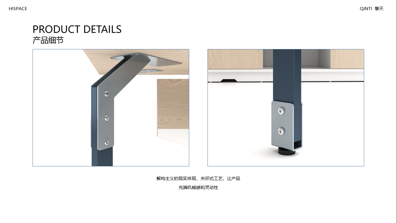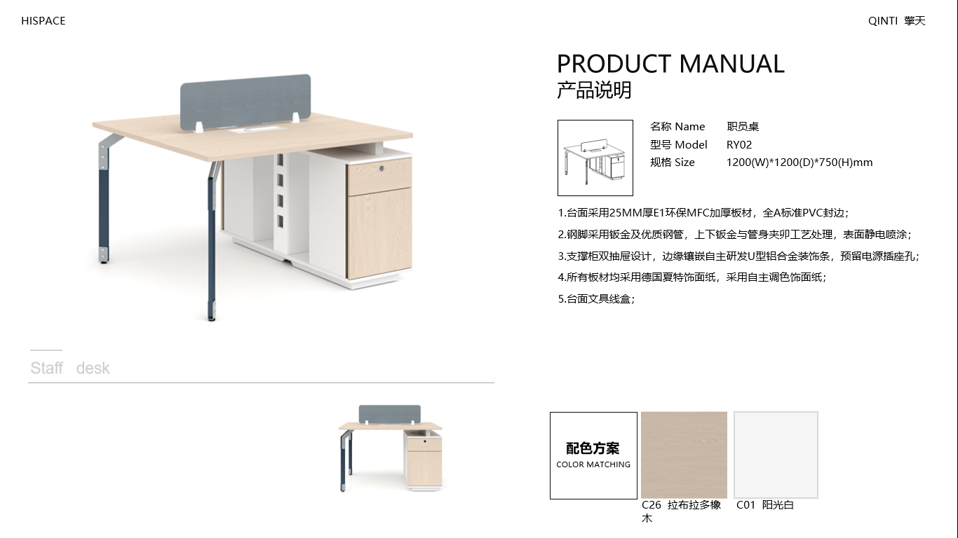 • 臺(tái)面采用25MM厚E1環(huán)保MFC加厚板材,全A標(biāo)準(zhǔn)PVC封邊;鋼腳采用鈑金及優(yōu)質(zhì)鋼管,上下鈑金與管身夾卯工藝處理,表面靜電噴涂;支撐柜雙抽屜設(shè)計(jì),邊緣鑲嵌自主研發(fā)U型鋁合金裝飾條,預(yù)留電源插座孔;所有板材均采用德國夏特飾面紙,采用自主調(diào)色飾面紙;臺(tái)面文具線盒